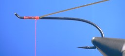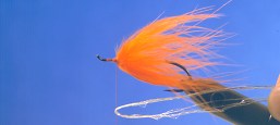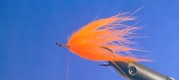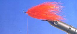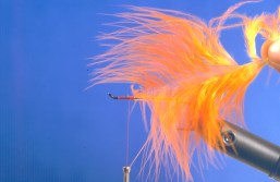 Select a single plume of hot orange marabou and tie it in place by the tip just behind the return of the loop eye.