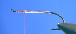 Attach the tying thread at the front of the hook. Close the hook eye with tying thread. Attach a long length of silver Mylar just behind the return of the hook eye. Position the Mylar so the silver side will show on the fly.